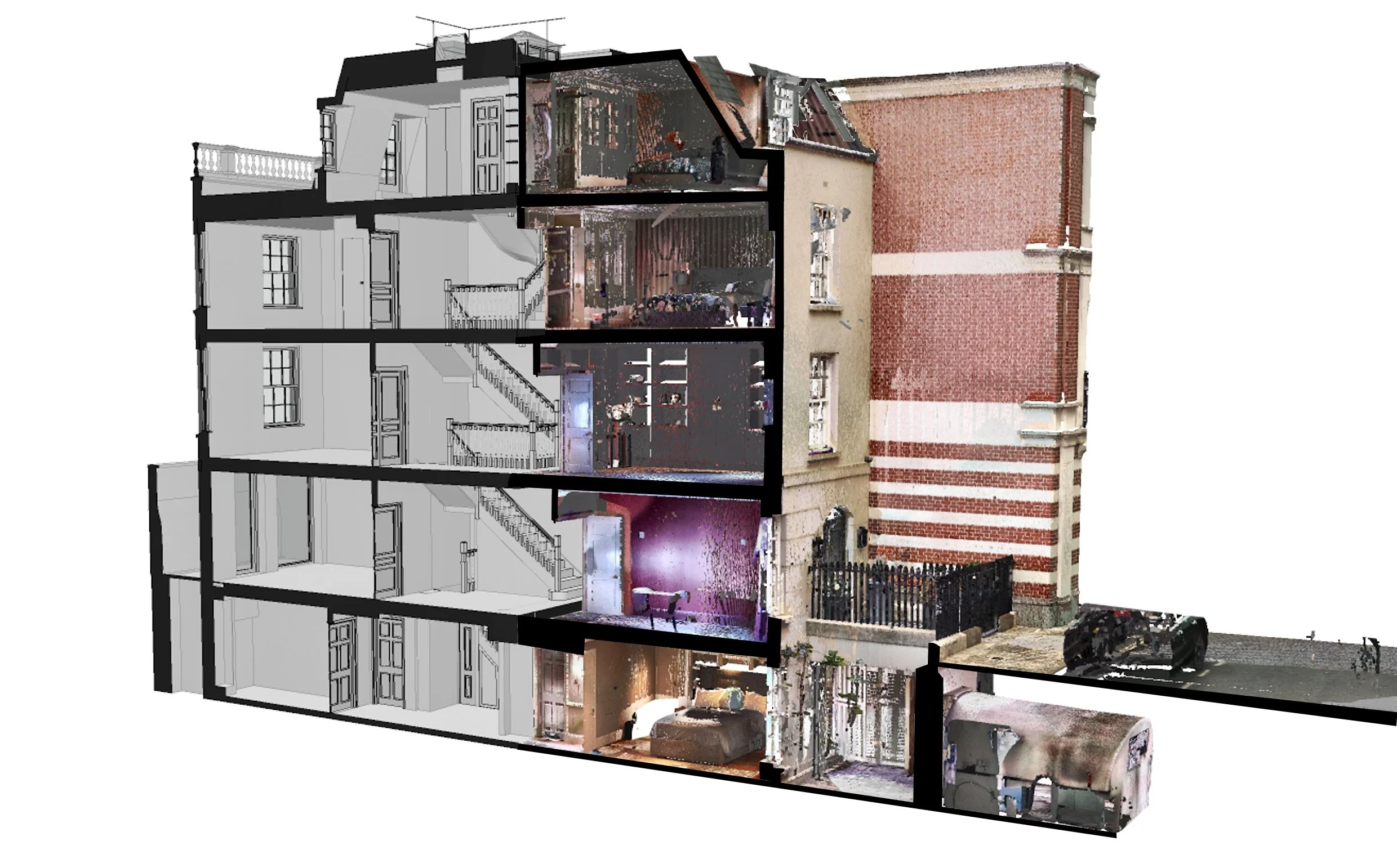 One from our colleagues at LA Surveys: a point cloud is the survey data our laser scanners capture of a property. They are literally a cloud of points, each with precise x,y and z coordinates and colour data. The point cloud survey gives us accurate and reliable data that we know we can trust when developing our proposals for a project.